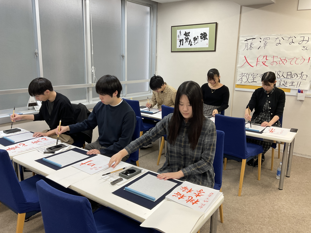 今回は、来年一月に予定している「ゆうきゅう戦 コシノジュンコ クリスタルCUP」に向けた色紙への揮毫に取り組みました。以前から取り組んできた言葉や、今年新たにテーマとした言葉など、先生のアドバイスをいただきながら、思い思いの言葉を色紙にしたためました。(事務局)